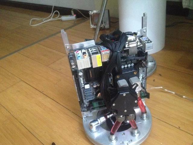 3、显卡可以上双槽的了,不需要像第一版改动接口,因为空间关系还是需要去掉显卡挡板(松几个螺钉而已),固定采用的方式是多个自由卡槽夹住PCB板,比较灵活,可以适应200mm高度以下的大部分显卡,这次我采用的是GTX750ti,公版卡长140mm,安装无压力。