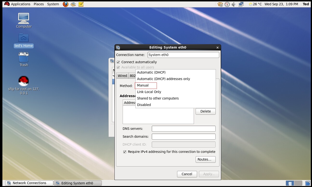 默认的网络连接方式为DHCP,现将其改为手动Manual(需要先了解整个网络段及网关,如图4)