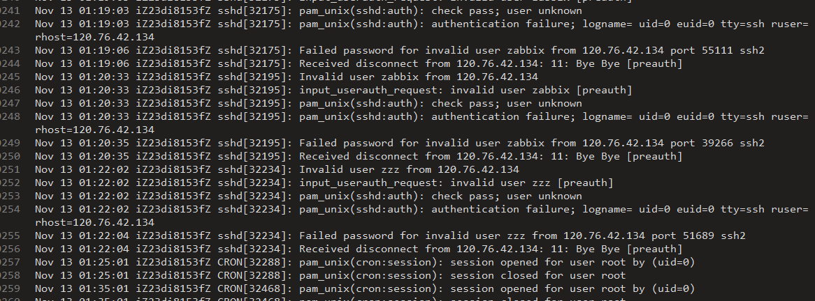 在auth.log中发现了大量的Failed,这说明有人在尝试暴力破解密码,最可疑的是大量的session opened for user root by (uid=0)(开始我觉得是入侵进去了?)。百度了下,发现几个线索: