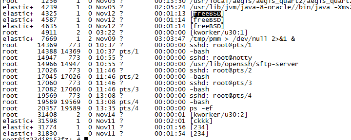通过elastic+ 启动的这几个进程显然是木马进程,依据上边的文档,可以初步说明木马没有取得root权限,而运行在elastic的用户权限底下。
