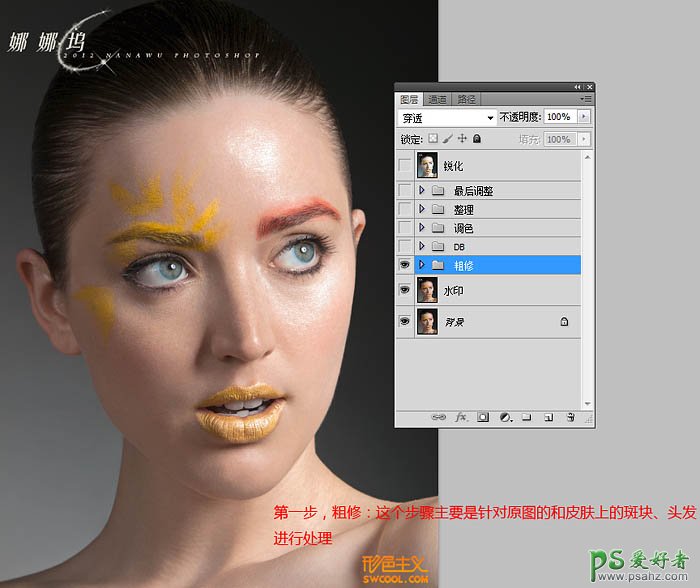 一、粗修:这个步骤主要是针对原图皮肤上的板块,头发进行处理,可以用图章或修复画笔来完成。