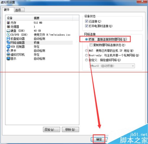 5、在“网络适配器”中我们将网络连接方式由“NAT" 改为“桥接”,即直接连接到物理网络,这样虚拟机和物理主机就处于在同一网段了,如图所示:
