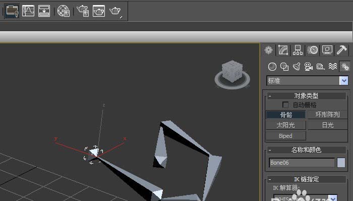2、在【标准】的面板上,鼠标左键单击【骨骼】,接着在透视图中,拖动绘制骨骼对象出来,如下图所示。