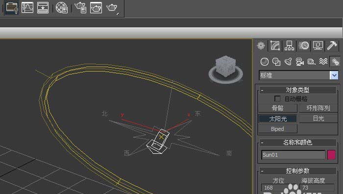 4、在【标准】的面板上,鼠标左键单击【太阳光】,接着在透视图中,拖动绘制太阳光对象出来,如下图所示。