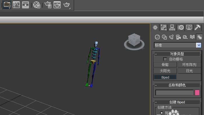 6、在【标准】的面板上,鼠标左键单击【Biped】,接着在透视图中,拖动绘制Biped对象出来,如下图所示。