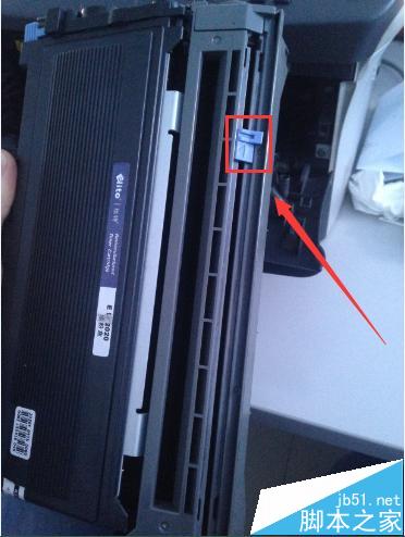 3、硒鼓拿出来后我们看见上面有个蓝色的小塑料片,左右拉一下 清理 然后安装硒鼓到打印机测试打印发现问题解决了。如图所示