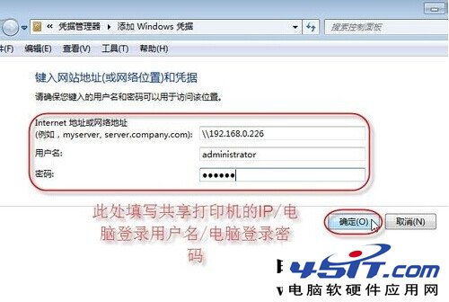 第五步:输入共享打印机的电脑(A)的网络路径,电脑登录用户名和密码,并点击“确定”按钮。