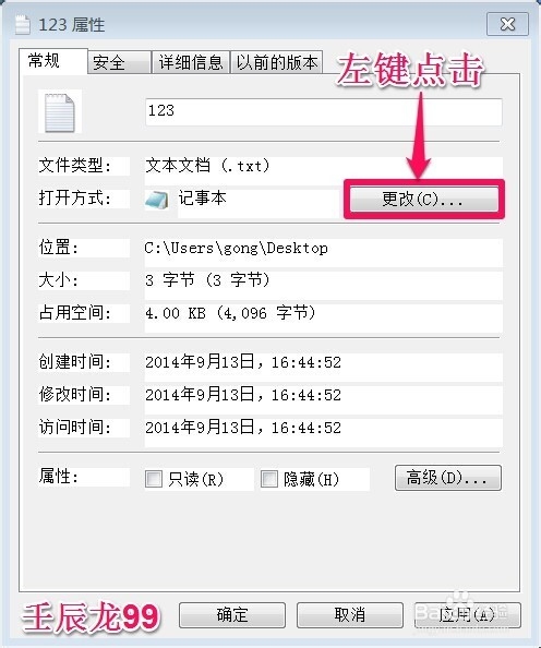 在打开的记事本属性窗口,我们左键点击:更改;