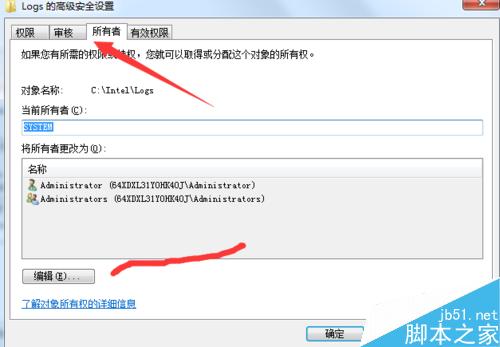 3、进入高级选项,点击上方【所有者】,然后点击下方的编辑选项。