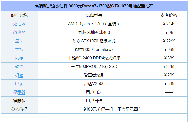 以上就是关于9000元Ryzen7-1700配GTX1070高端电脑配置清单推荐的介绍,对于如今高端装机用户来说,AMD平台终于可以考虑了,并且性价比相比Intel平台要高很多,这也是为什么Intel中高端处理器纷纷降价的原因,可以说如今的AMD高端平台给了Intel不小的压力,这对于DIY装机用户来说,不仅有了更多的选择,也有利于高端装机平台价格的降低。