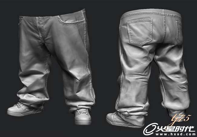 我很喜欢牛仔裤的质感和细节,所以花了很长时间去刻画它。为了让它看上去更坚挺和牛仔裤上成小块状的体积感,这里我用了Smooth笔刷来处理块状的切面。