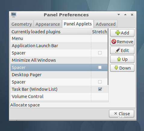 11、右键单击LXDE面板,然后选择“ 面板设置 ”进行自定义。从“面板首选项”窗口中,您可以根据扫描,大小和外观更改其位置。您还可以切换面板小程序,并根据您的喜好重新排序。