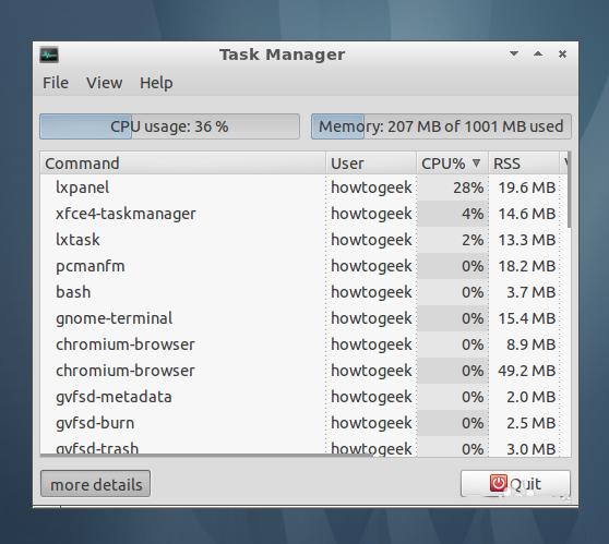12、还有一个基本的任务管理器,在菜单中的系统工具下找到。它显示总CPU和内存使用情况以及进程列表。右键单击进程以将其杀死或更改其优先级。