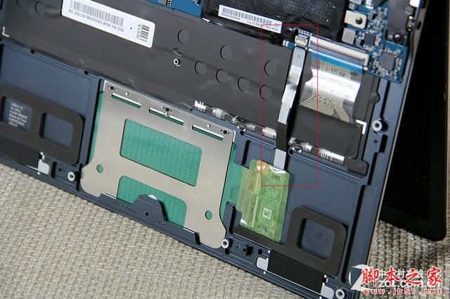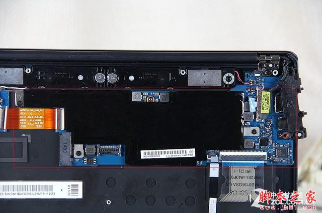 拆下电池之后,我们可以看到“隐藏”在电池下方的触控板模块组,主要由三个部分构成,包括:触控板的主体部分,右侧的控制电路,以及与主板相连接的排线。同时可以看到,930X2K机身内部利用有限的空间,在面板上进行了区块化设计,一体成型的面板进行了预先的规划。