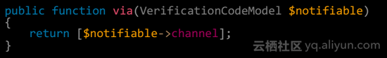 首先,在数据表迁移中存在一个字段 channel 也就是通知频道标识,我们可根据这个值来决定用什么方式发送验证码,而这个操作在通知类的 via 中实现的: