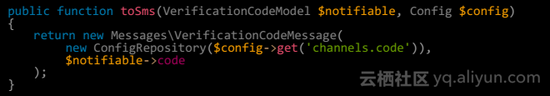 然后我们回到 VerificationCode 验证码通知类中,增加 toSms 方法,我的代码如下: