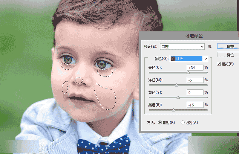 第三步:选择"可选颜色"工具,微调数值使肤色均匀。