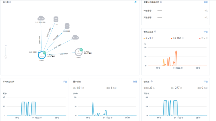 1.拓扑图:观察周期内,当前集群实例与其他集群实例或者第三方服务的拓扑关系,以及他们彼此间的请求频率和平均响应时间。
