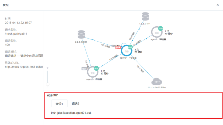 点击照相机图标,你可以看到这次请求处理中具体的调用链路、响应时长、以及报出的异常信息等快照信息。