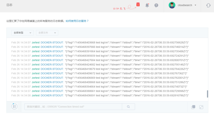 日志服务可以在底层搜索框进行自由化的搜索,进行搜索后日志仍会实时的输出(只输出包含搜索条件的日志),方便你快速的定位日志中的内容,搜索命中的结果还会进行高亮的显示。