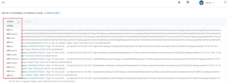 (1)日志分类、选择过滤框可以按容器名、服务名以及日志文件名进行日志过滤;