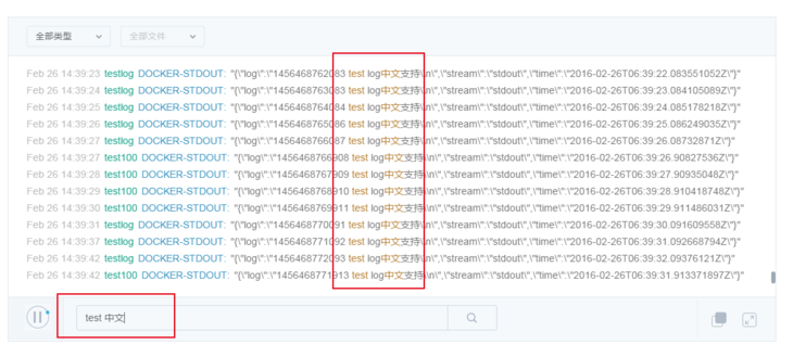 (2)日志主体显示区域中,每行日志分别显示日志时间、容器/服务名、日志文件、日志内容;