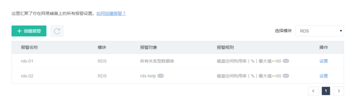在监控首页,点击「设置」进入设置报警页面。你可以对报警规则、报警对象和接收报警信息的手机、邮箱进行修改,各项配置详细说明请参看 创建报警。你还可以在该页面还可以删除报警。