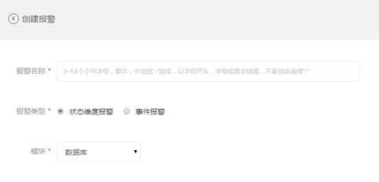 点击监控首页左上角的「创建报警」,进入创建报警页面。按提示填写报警名称,选择报警类型。