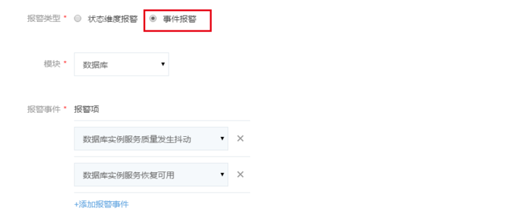 当选择报警类型为事件报警时,可以在这里配置报警事件,支持同时添加多条事件,满足其中任意一条时即触发报警,如下图所示: