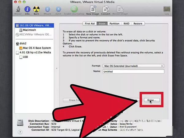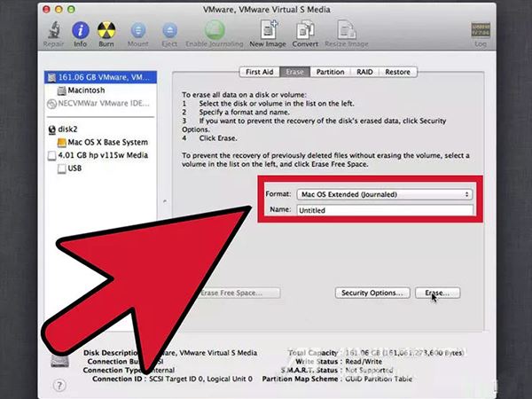 5、从“格式”下拉菜单中,选择Mac OS扩展(日志)这是安装OS X操作系统必需的格式。