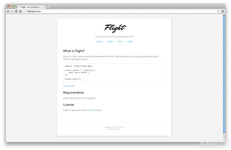 Flight是一个快速、简单、可扩展的微型PHP框架,允许用户快速的构建Restful Web应用程序,同样易于学习和使用,简单但是很强大!