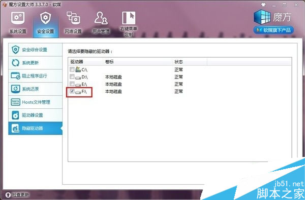 2、如下图所示,在魔方设置大师中,选择:安全设置-->隐藏驱动器。
