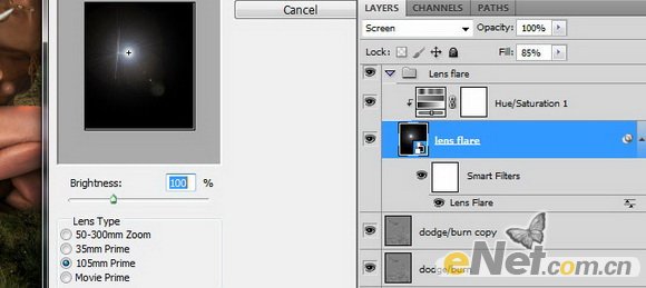 9.选择“滤镜>渲染>镜头光晕”,设置105毫米聚焦。将图层的混合模式设置为“滤色”,并将不透明度设置为80%