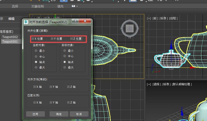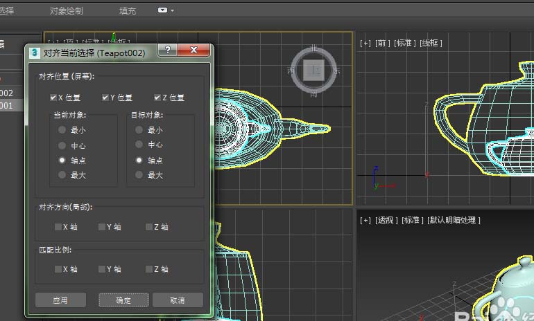 5、随后,我想将另一个茶壶进行缩放,且缩放比例和之前的茶壶一致,则需要用到对齐工具。选择该茶壶后再按快捷键“Alt+A”或点击对齐工具后,选择原茶壶。弹出“对齐当前选择”对话框。