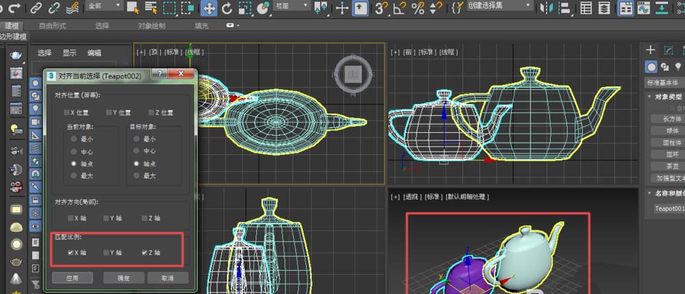 8、如果想匹配比例完全一致,则勾选x、z轴。注意,这里的坐标均指世界坐标系,而不是局部、视图坐标系。勾选完之后,得到的便是缩放比例完全一致的茶壶了。