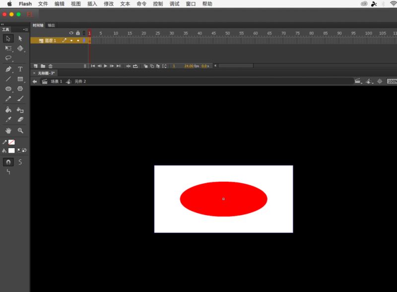 3、然后回到舞台上,再次建立元件,还是图形,这次画一个矩形出来,比椭圆要大,然后把椭圆拖进去对齐到舞台中央