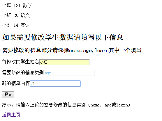 aler+=u"请输入正确的需要修改的信息类别(name,age或learn)"