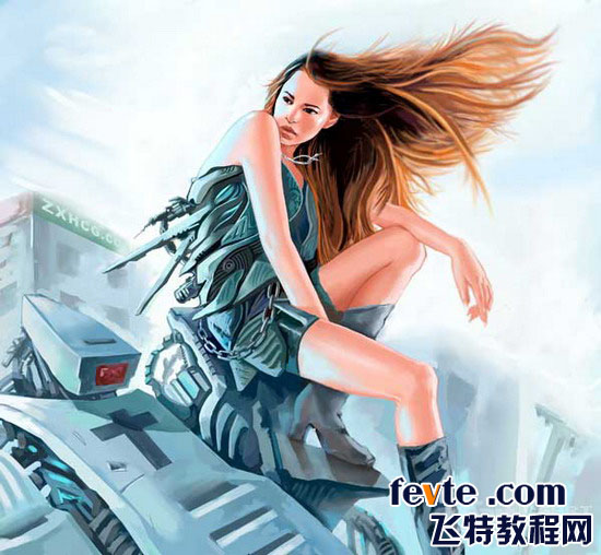 人物、机器人、背景已经基本上画完了,最后该到收尾的时候了。整个画面的颜色看起来比较偏冷,这也是个人的爱好吧。有的地方还要用Blenders里的Detail Blender3画笔来过度一下,这样感觉画面更加柔和一些。再到photoshop里面打开这张画,用曲线工具调一下整体的颜色,在画上签个名就可以收笔了。