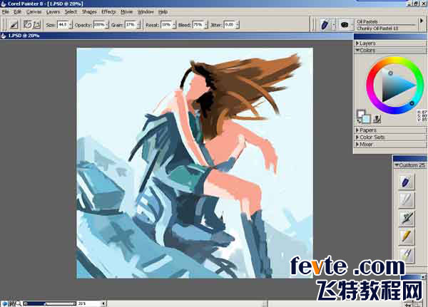 在painter里选择Oil Pastels里的Chunky Oil Pastel 10画笔,Oil Pastels笔的覆盖力强的特点是我最为喜欢的。我没有用线来画草稿,而是直接用大块的颜色来画出人物和场景的大概关系。