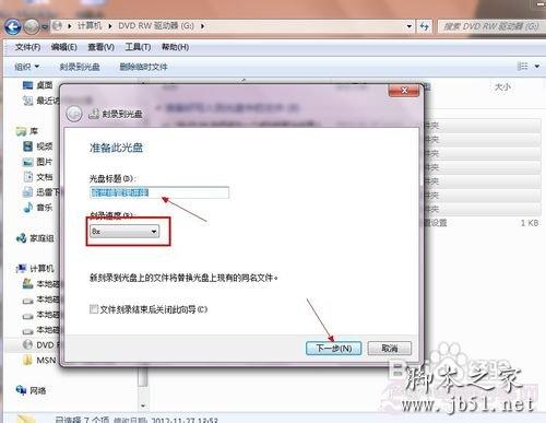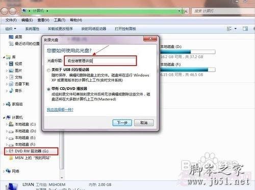 4点击左面资源管理器当中的DVD RW驱动器,在弹出的对话框“光盘标题”栏中输入:俞世维管理讲座,点击“下一步”
