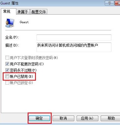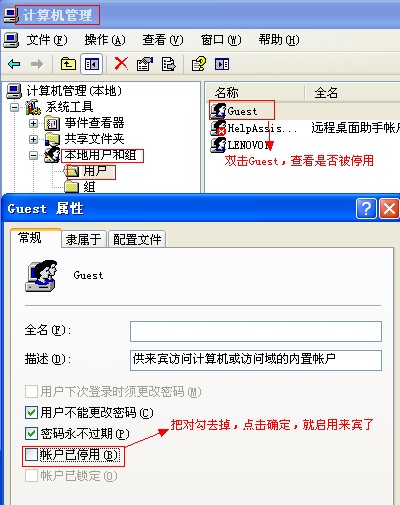 (1)来宾账户没启用,依次打开“我的电脑”右键“管理”“本地用户和组”“用户”“启用来宾”即可。