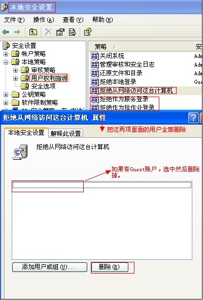 (2)在“运行”里输入“secpol.msc”启动“本地安全设置”选中“用户权利指派”将“拒绝从网络访问这台计算机”里面的“guest”用户删除,并把“拒绝作为服务登录”和“拒绝作为批作业登录”里面的所有用户也全部删除。