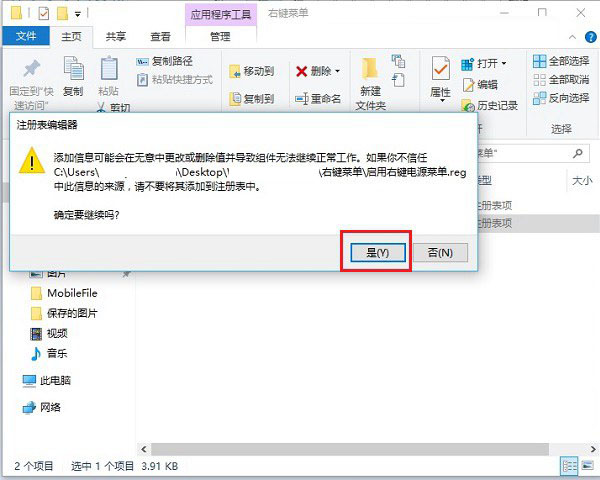 1、首先下载win10右键关机注册表文件,里面包含“启用右键电源菜单.reg”和“关闭右键电源菜单.reg”文件,我们直接点击“启用右键电源菜单”文件「本地下载」,启用即可,如下图所示。