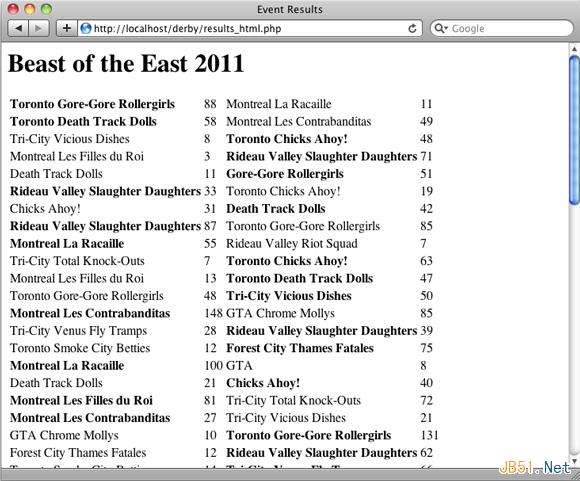 $fill 变量可通过切换来改变表中每行的颜色。优胜队的名称和得分用加粗、斜体字体表示,这样可以清晰显示它们。还需注意的是,字体从标题的 Arial 字体更改成了显示比赛内容所用的 Times 字体。