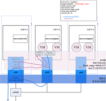 1)实例经过所在主机的flat_interface(这是一个flat网络),连接到nova-network所在的主机(控制节点);