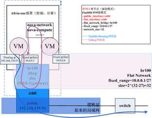 1)在主机上建立一个对应控制节点的网桥(br100),把其上实例(虚拟机)桥接到一个网络(br100所在的网络);