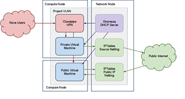 每个项目获得一些只能从VLAN内部访问的私有IP地址,即私网网段。每个项目拥有它自己的VLAN,Linux网桥还有子网。被网络管理员所指定的子网都会在需要的时候动态地分配给一个项目。