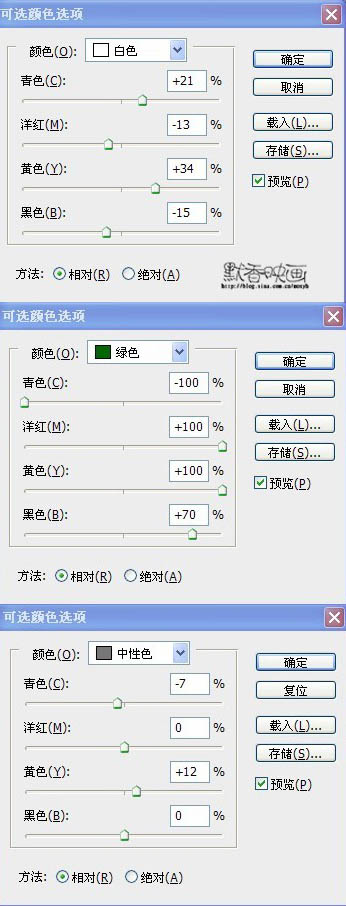3、菜单栏(说明下就是工具栏)选择“图像”——调整——可选颜色选项,依次对白色、绿色、黄色、中性色作调整,具体参数如右图,得到效果图4。