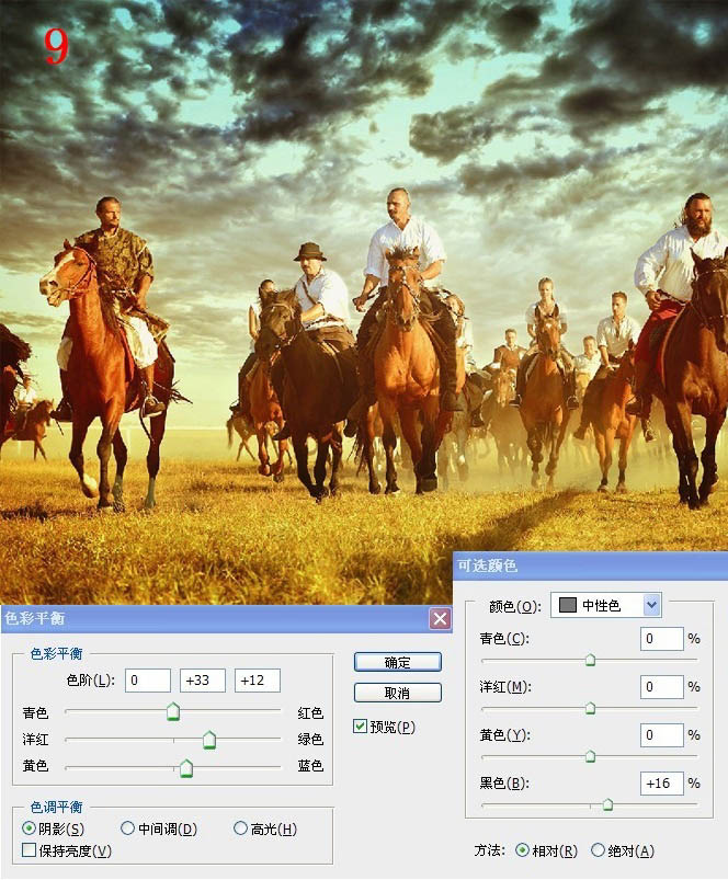 7、给图片加上混合光线,色彩如上图,这个可以用柔色的画笔来画,对色次啊把握不好的话直接用吸管工具在我这里吸取吧,画好光线后,选择混合模式为“柔光”。 最后定色的两步,选择菜单“图像”——调整——色彩平衡(参数如右下角图),选择菜单“图像”——调整——可选颜色(参数如右下角图)得到效果图9。