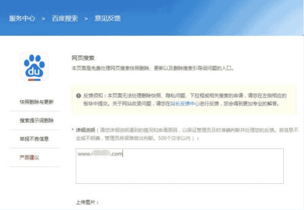 除了利用robots文件禁止蜘蛛爬行之外,小编还在百度的服务中心(http://help.baidu.com/webmaster/add?rdm=1akn086v3#4)又一次提交了该页面。当然这是小编针对该问题实行的解决方式,并不是每位站长都像小编一样,不知道该如何操作吧!